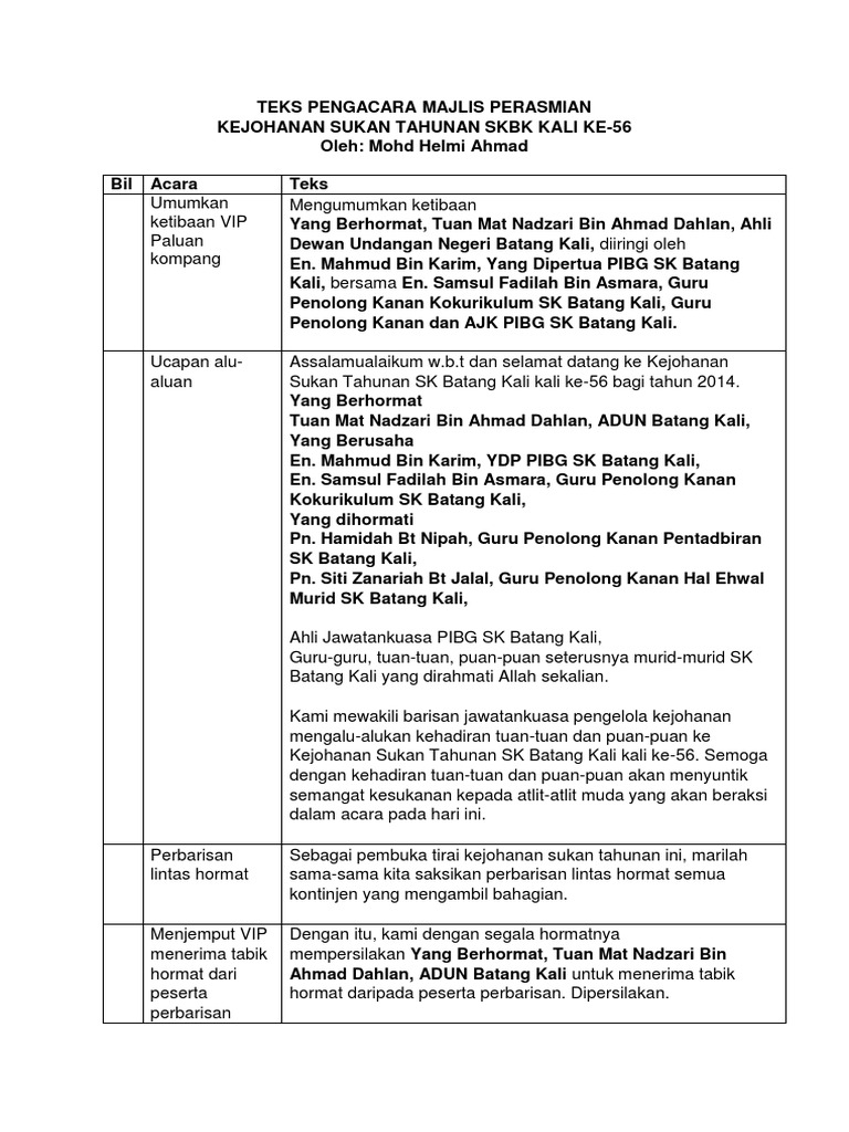Skrip majlis perasmian pembukaan sukan tahunan 2009. Sawah menghijau di tengah bendang, tumbuh dipinggir pohon bidara, pemanis kata selamat datang, awal bismillah tuan, saya ambil skrip pengacaraan yg tuan buat sebagai contoh kpd anak didik saya yg akan menjadi pengacara majlis persaraan cikgu di sekolah. Please copy and paste this embed script to where you want to download 49095677 skrip pengacara majlis perasmian bangunan baharu sk jijan. Contoh bacaan teks pengacara majlis. Mengumumkan ketibaan yang diraikan puan bedah bt.